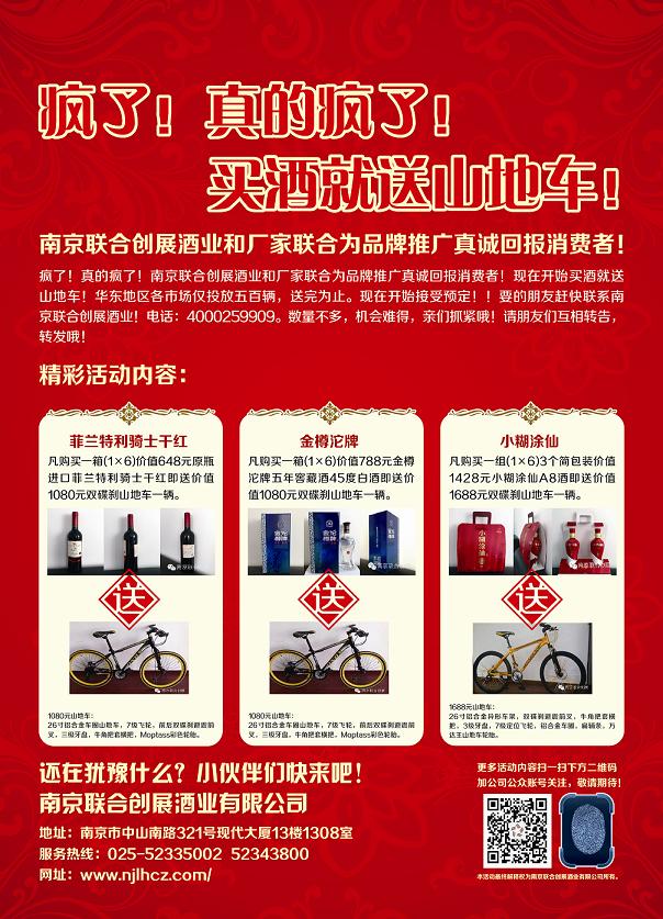 号外!南京联合创展酒业有限公司推出的买酒送山地车特惠活动华东各地市场首批500辆山地车刚到货即被抢购一空。都说酒好、车子漂亮物超所值。应广大消费者需求,我公司现向厂方申请各地市场追订500辆山地车,近日将全部到位。